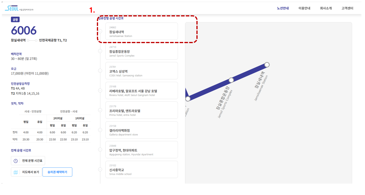 - 왼쪽의 사진처럼 버스 노선도의 정보를 볼수 있으며, 그 중 잠실 새내역을 클릭하면, 우측 화면 처럼 나타납니다.