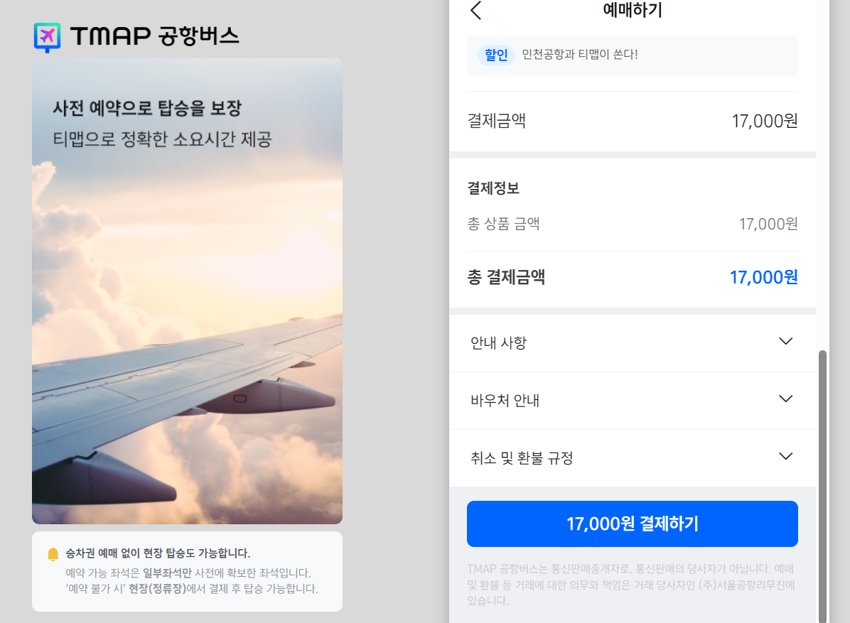 - 버스 요금 : 17,000원 (어린이 : 11,000 원), 인천공항 상근 근로자 10,000 원