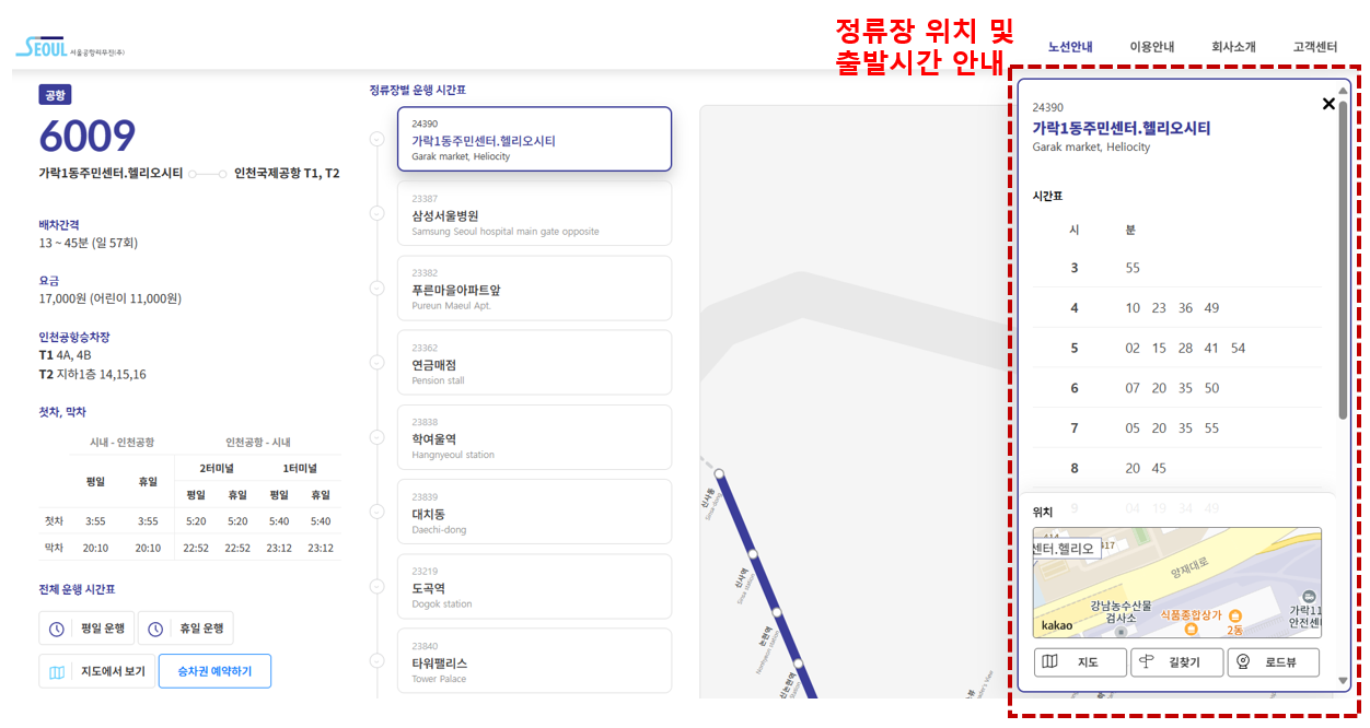 6009번 버스노선과 운행시간 등 운행 정보를 아래와 같이 안내하고 있습니다.