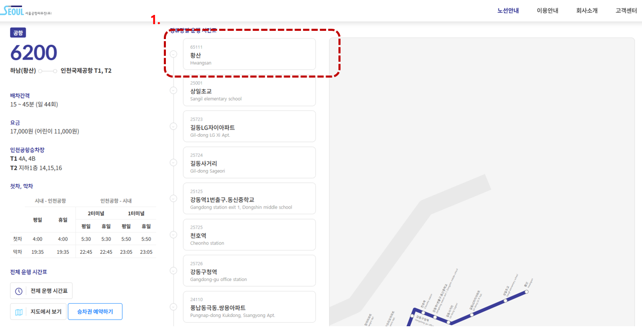 - 평일, 휴일 (제1터미널 출발 기준) 첫차 05:50 , 막차 23:05