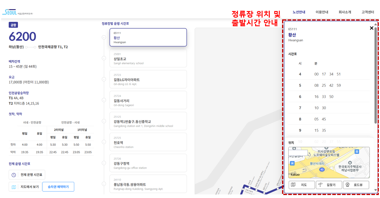 6200번 버스노선과 운행시간 등 운행 정보를 아래와 같이 안내하고 있습니다.