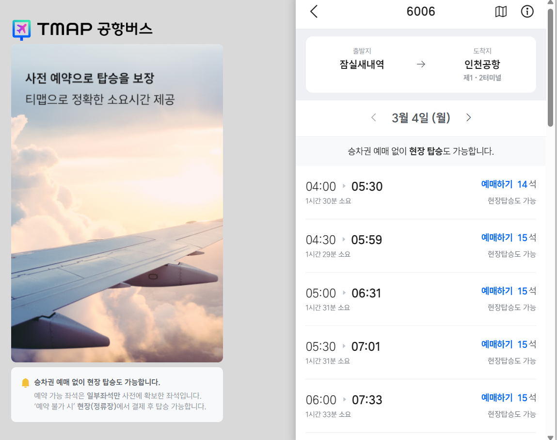 예매를 하시고자 하면, 승차권 예매하기 버튼을 클릭하면 다음의 화면으로 이동합니다. 티맵공항버스를 통해서 예매를 진행할 수 있습니다.