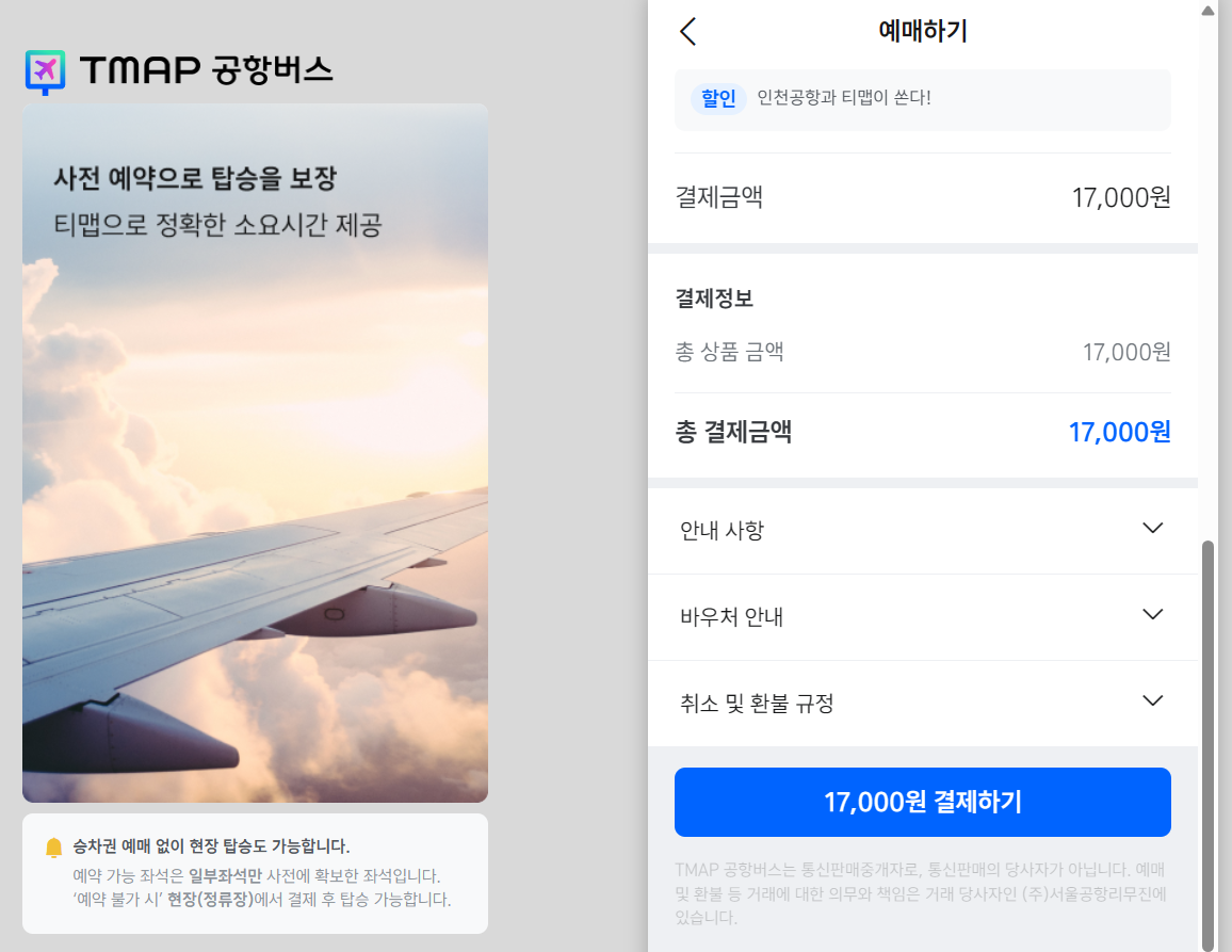 티맵에서는 서울 일부지역에 운행 중인 공항버스 예매 서비스를 제공하고 있습니다.