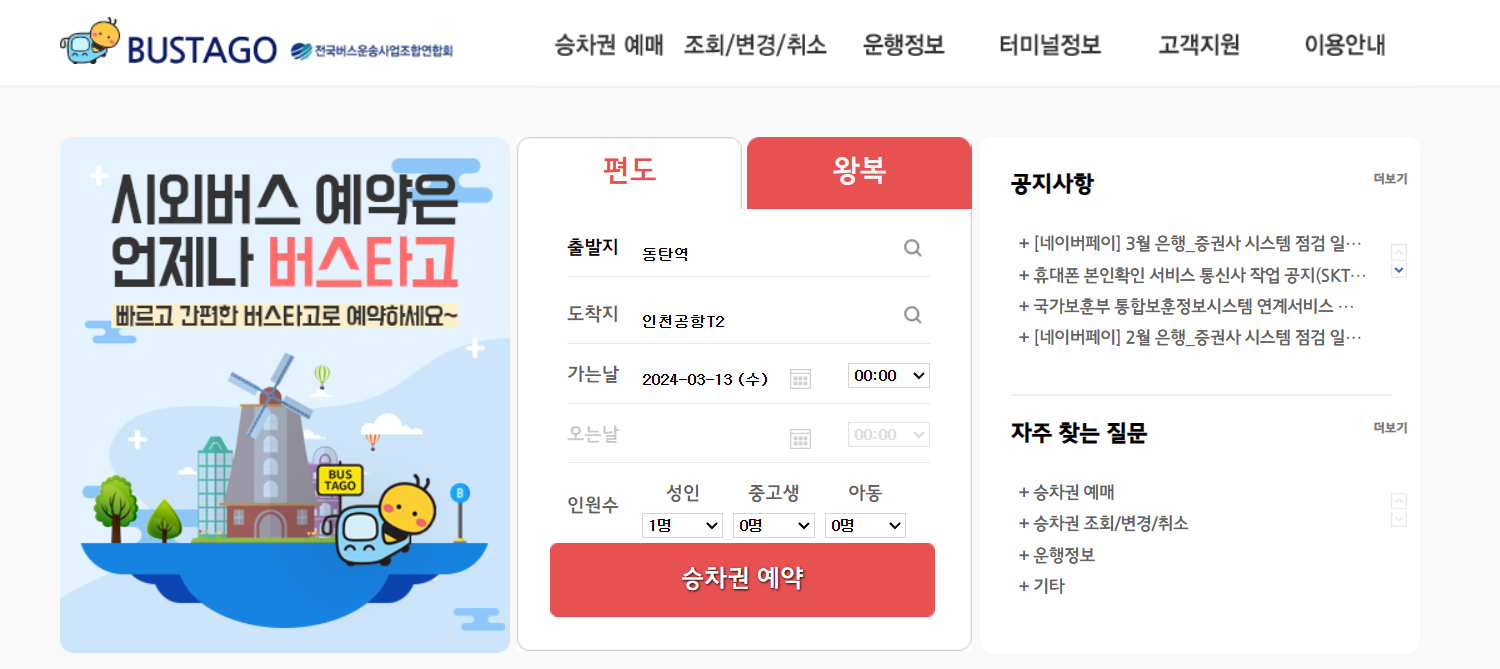 버스타고는 시외버스 터미널 방문없이 인터넷이나 모바일로 시외버스 승차권 예매가 가능한 서비스를 제공하는 앱 입니다. 특히나 시외버스를 타고 인천국제공항으로 가야 할 때, 버스타고 앱을 통해 예매를 하면, 편안하게 원하는 시간에 이동할 수 있으며 좌석이 없어 다른 운송수단을 찾아야 하는 불편함도 줄여 줍니다.