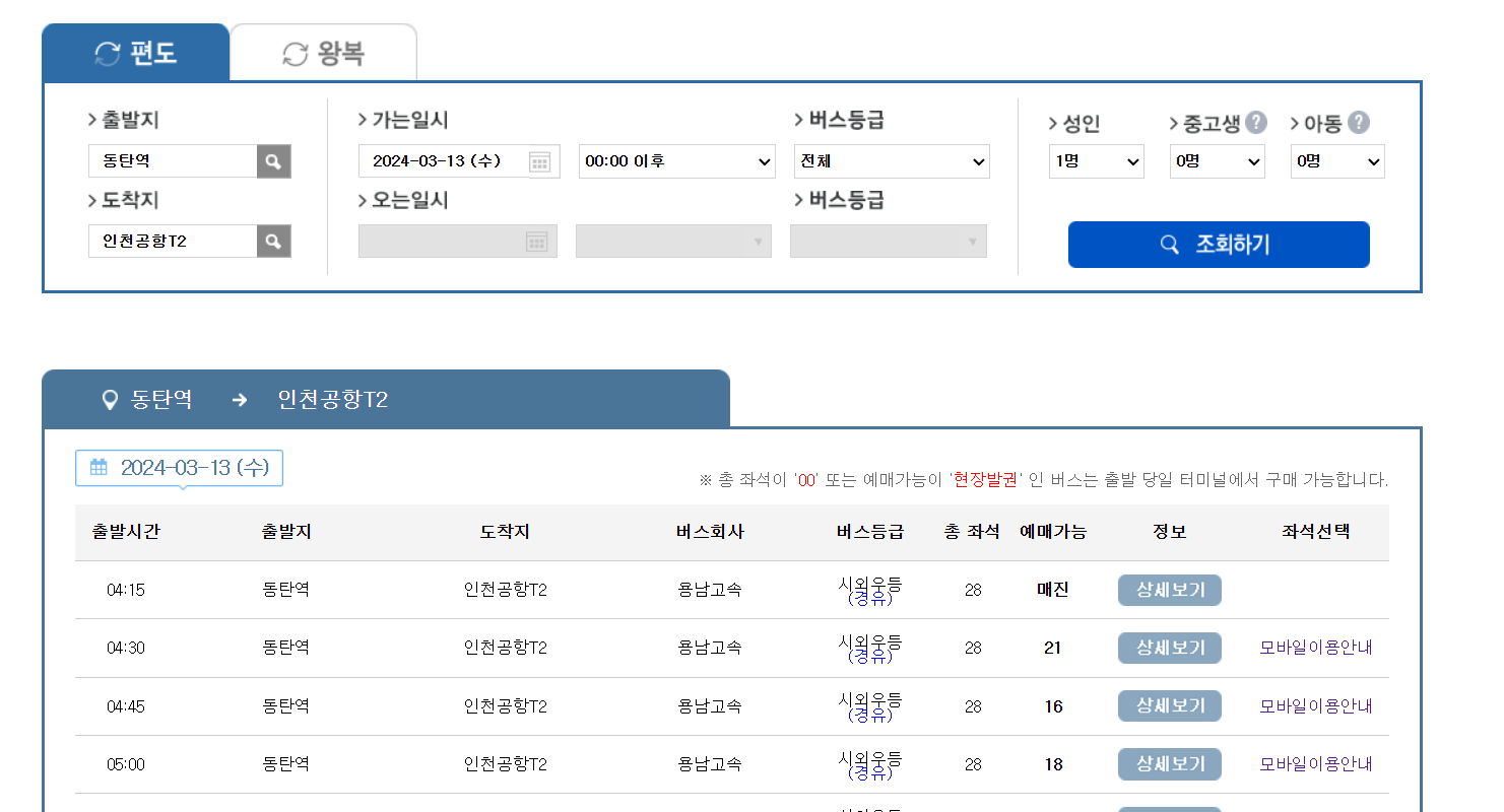 시외버스를 통해 인천공항으로 이동하는 버스의 종류는 28석 버스나 21석 프리미엄 버스로 운행합니다. 좌석수가 많지 않기에 여행 성수기나, 평일 새벽에 이용시 매진이 되는 경우도 종종 있습니다. 그래서 버스타고 앱이나 홈페이지를 통해 공항가는 버스를 예매하면 좀 더 편리하게 이동하실 수 있습니다.
