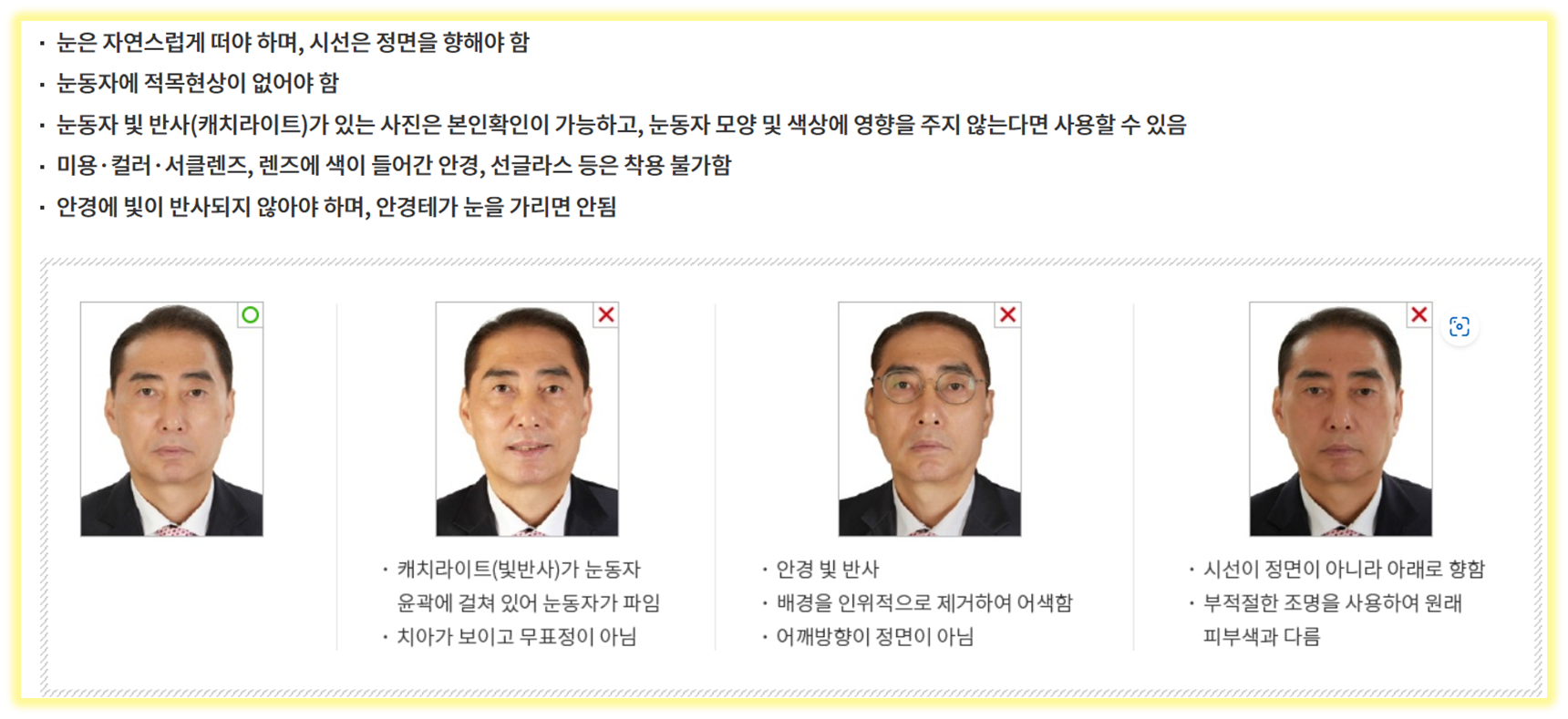 - 머리가 중앙에 위치해야 하며, 얼굴과 어깨는 정면을 향해야 함 (측면사진 불가)