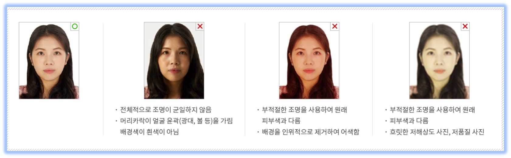 - 흐릿하거나 픽셀이 깨진 저화질 사진은 사용할 수 없으며, 주름(구겨짐) 또는 얼룩이 있는 사진은 사용불가