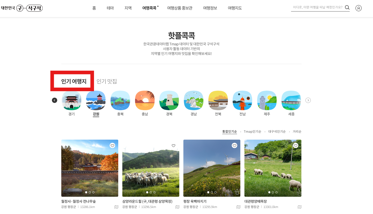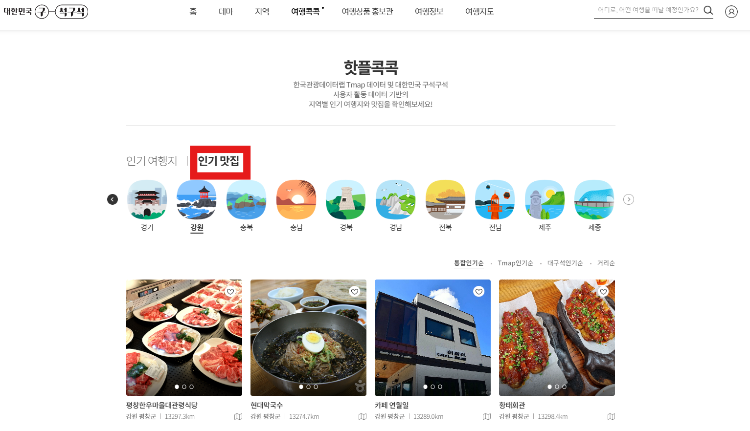 대한민국 구석구석 사이트에서는 평창군의 핫플과 다양한 여행지, 맛집을 안내하고 있습니다.